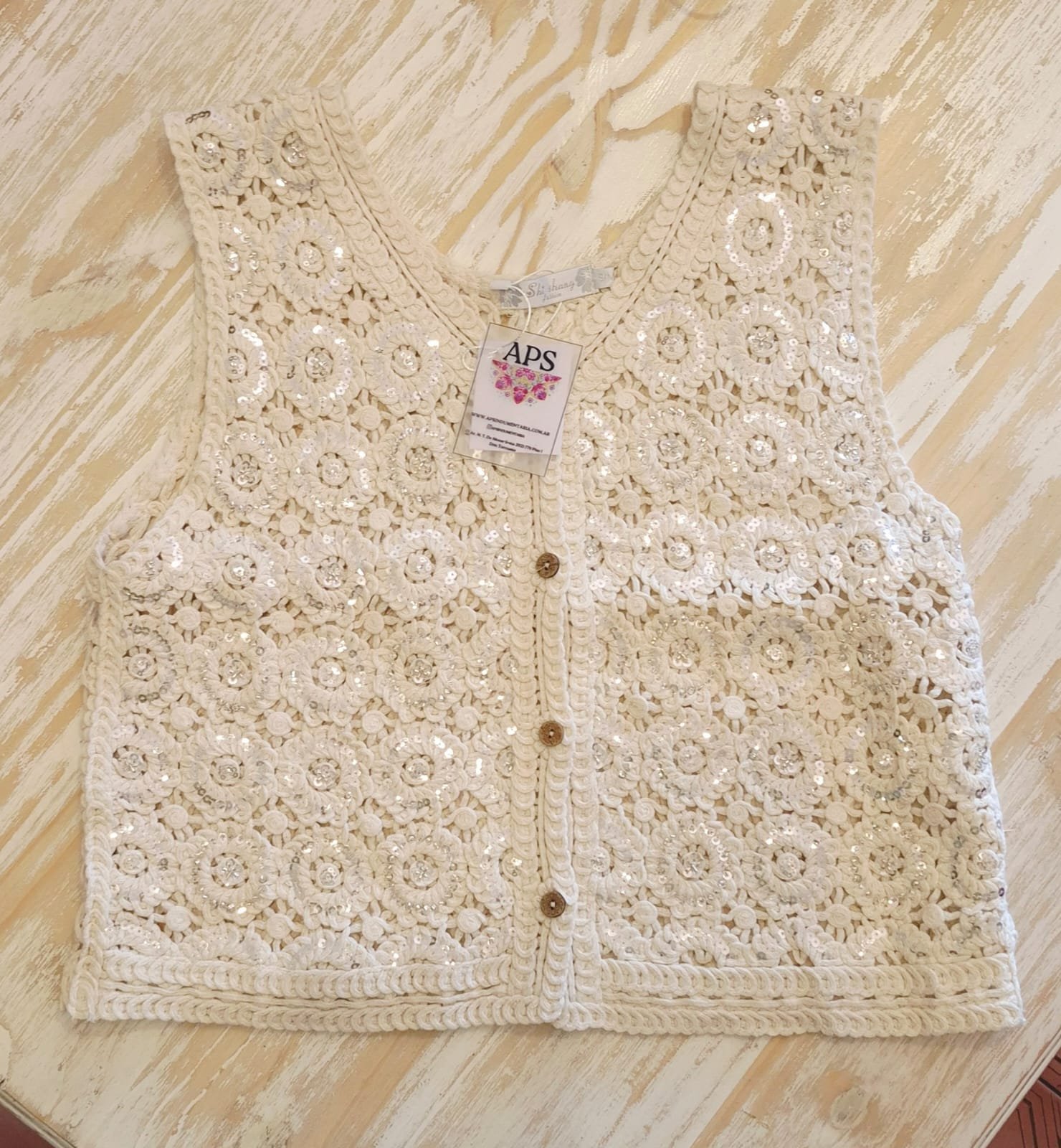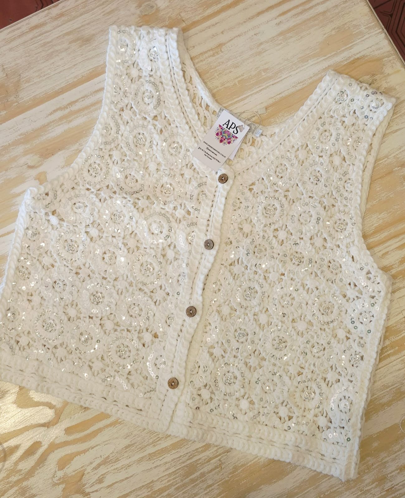 Delicado chaleco tejido con detalles de lentejuelas al tono.