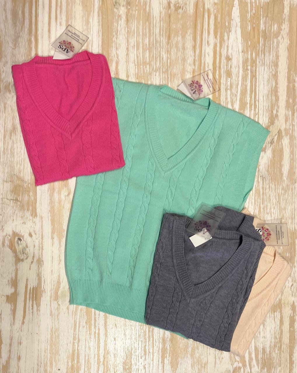 Delicado chaleco en bremer, con detalle de trenzas. Escote en V