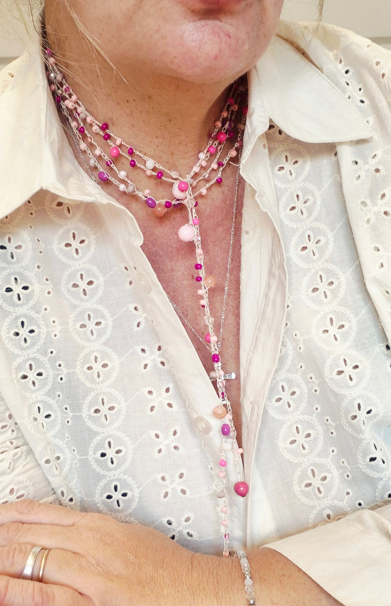 Collar tejido al crochet con diferentes piedras, cuentas, cristales y escallas.