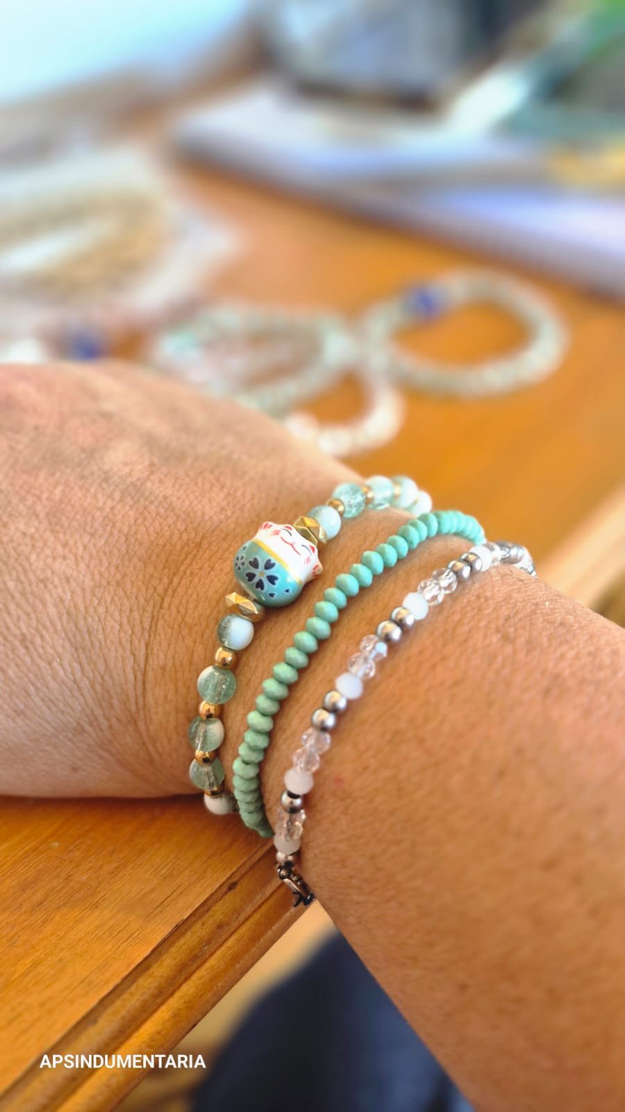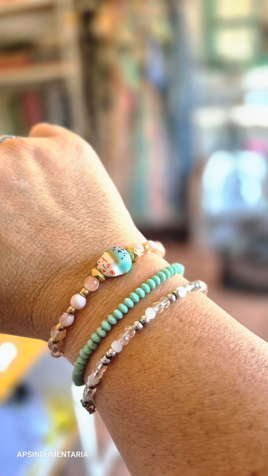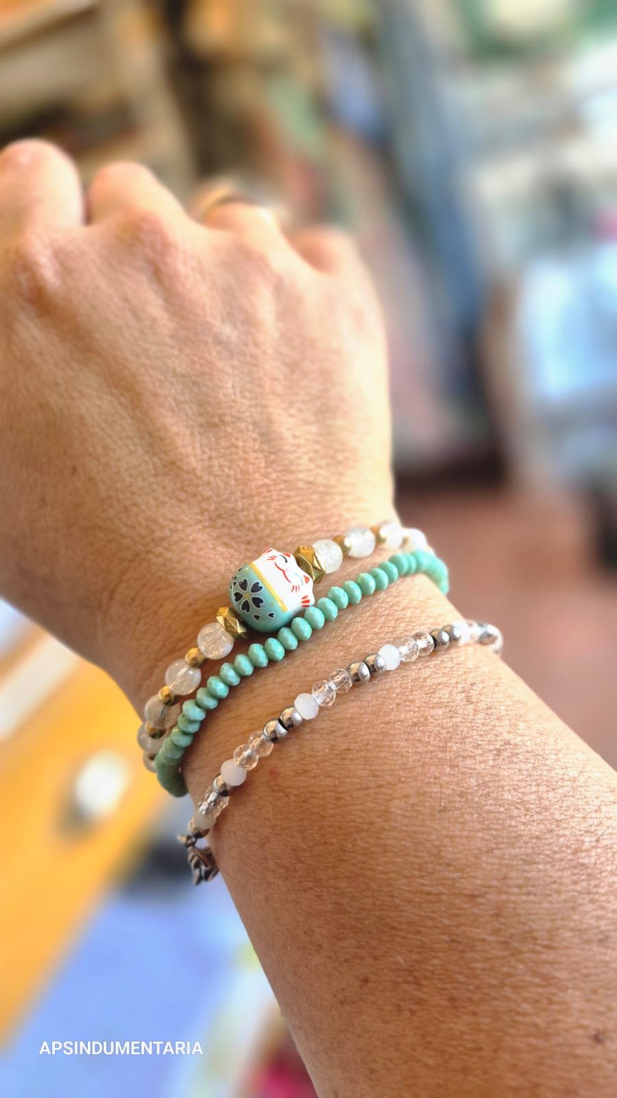 Puslsera eleastizada, con cuentas de vidrio y dije pasante en cerámica esmaltada.