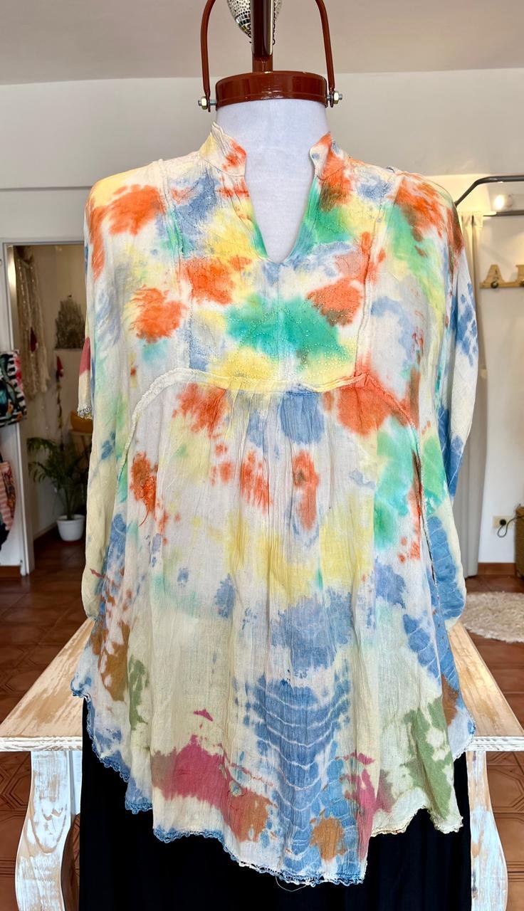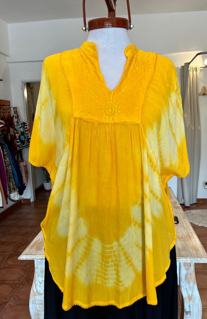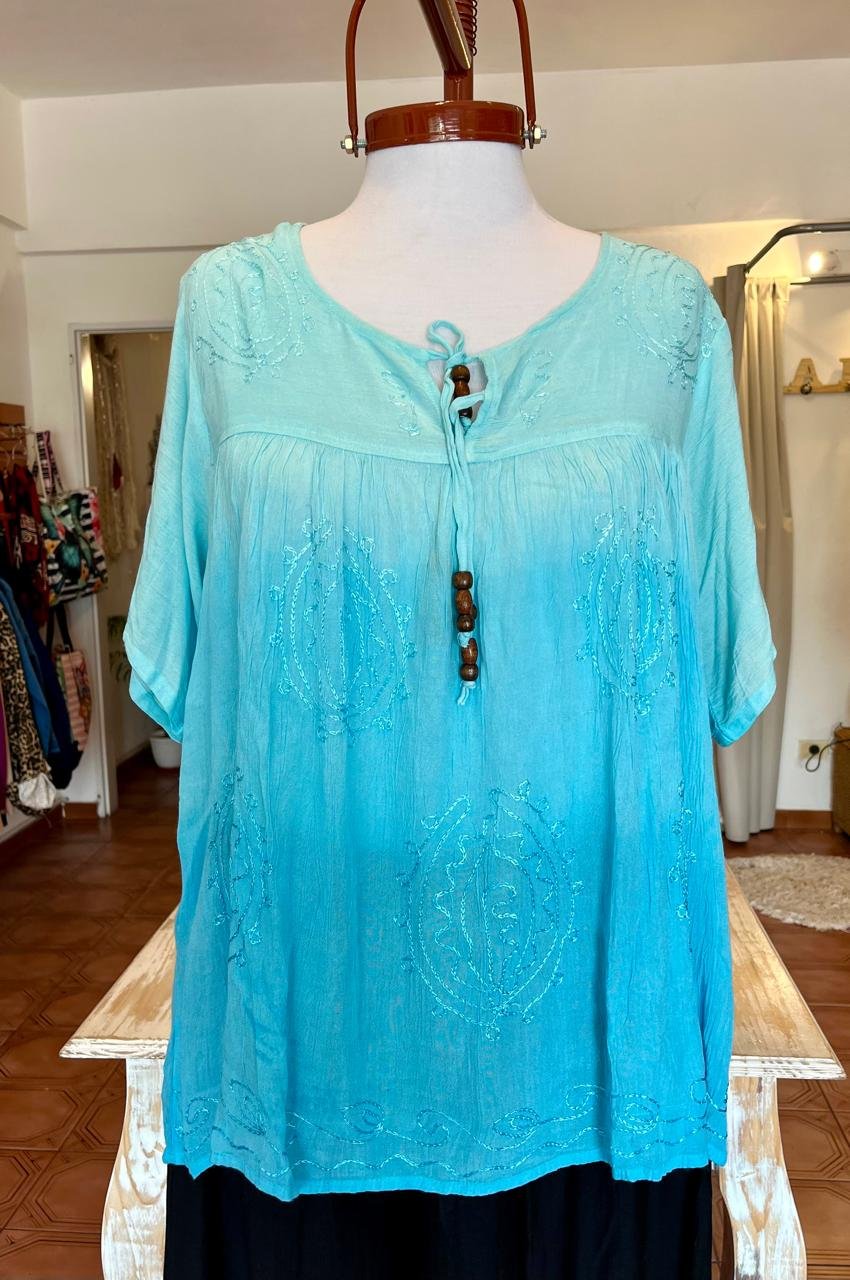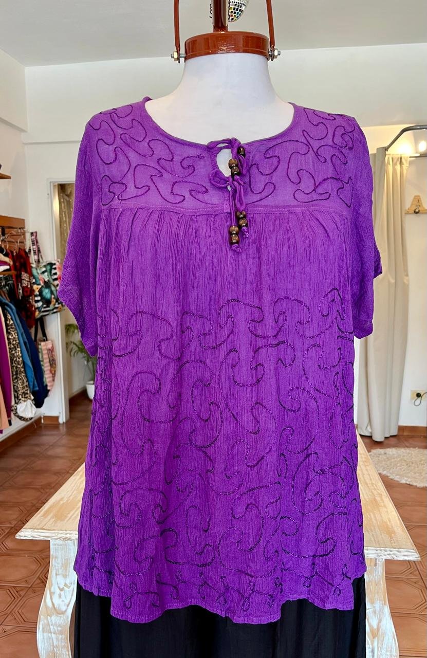 Camisola en bambula, mangas tres cuartos. Detalle de bordados.